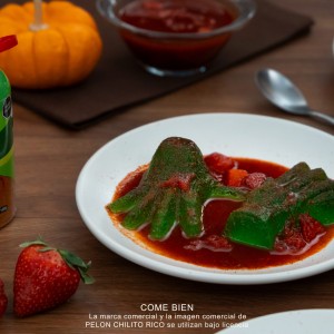 ¡Prepárate para una experiencia espeluznantemente deliciosa con nuestra mano de gelatina y PELON CHILITO RICO! Dale un toque de diversión a tus postres con esta receta única.