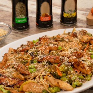 ¡El plato asiático perfecto en casa! Pollo, verduras y fideos salteados con salsa teriyaki.