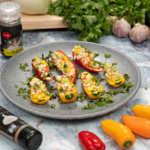 Disfruta de unos deliciosos mini pimientos rellenos de surimi. ¡Esta receta es perfecta para servirla como platillo principal o para acompañar un plato fuerte!